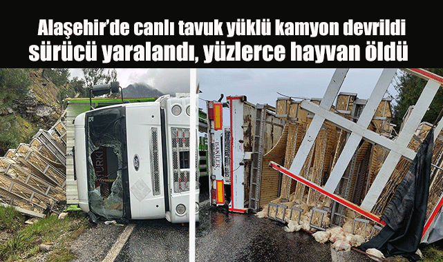 Alaşehir‘de yağışlı hava nedeniyle kayganlaşan yolda sürücüsünün direksiyon hakimiyetini kaybetmesi sonucu canlı tavuk taşıyan kamyon devrildi. Meydana gelen kazada yüzlerce hayvan telef olurken, araç sürücüsü yaralandı.