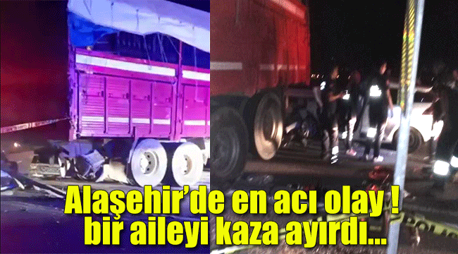 Alaşehir'de kamyon ve otomobilin çarpışması sonucu aynı aileden 1 kişi hayatını kaybederken 2’si çocuk 3 kişi de yaralandı.