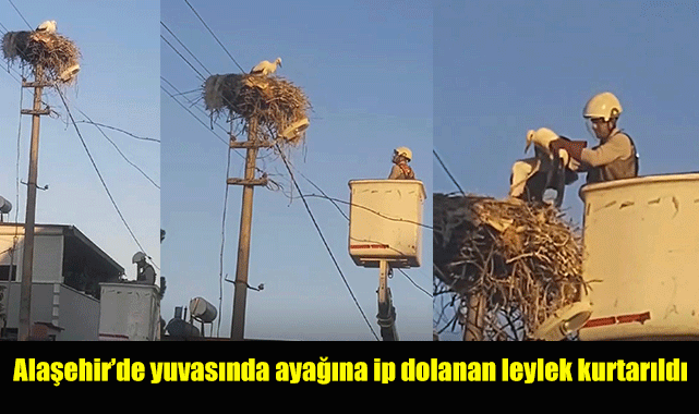 Alaşehir’de ayağına ip dolandığı için yuvasında mahsur kalan leylek için mahalleli seferber oldu. Ayağına dolanan ipten kurtarılan leylek uçarak özgürlüğüne kavuştu.