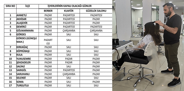 Manisa Valiliğinin konuya ilişkin kararı aynen şöyle: “Perakende Ticarette Uygulanacak İlke ve Kurallar Hakkında Yönetmeliğin "Çalışma gün ve saatleri'' başlıklı 13 ncü maddesi hükmü gereğince Manisa İl ve ilçelerinde faaliyet gösteren berber, kuaför ve güzellik salonlarının 01.10.2022 tarihinden itibaren haftada bir gün ekteki listede belirtilen günlerde kapalı tutulmalarına, uygulamaya aykırı hareket edenlere 6585 sayılı Perakende Ticaretin Düzenlenmesi Hakkında Kanunun 18 inci maddesinin (g) bendi hükümleri çerçevesinde işlem yapılmasına,