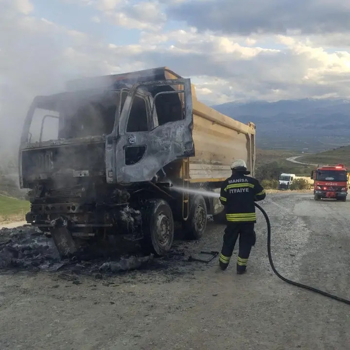 Alaşehir'de seyir halindeki damperli kamyon bir anda alev alarak yanmaya başladı. Yangın, itfaiye ekipleri tarafından söndürüldü.