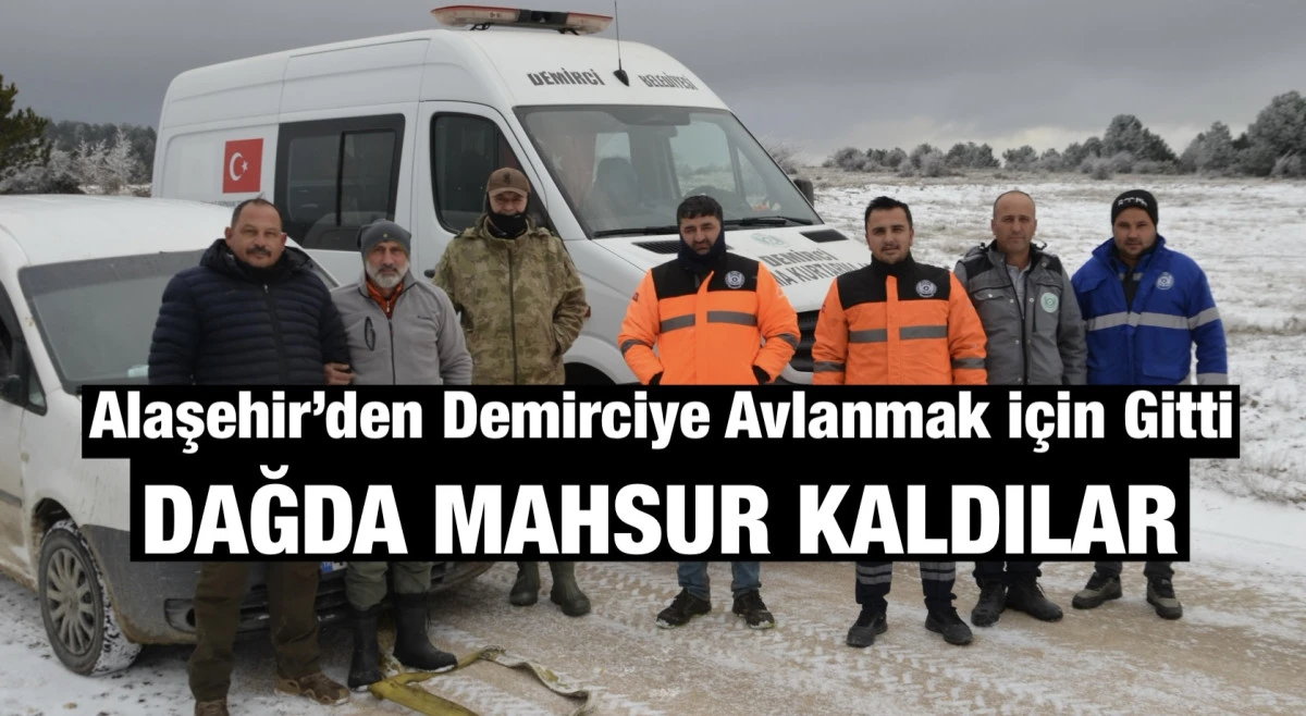 Demirci'de dağlık alanda karlı havada avlanmaya çıkan 3 avcı, araçlarıyla mahsur kaldı. Demirci Belediyesi Arama Kurtarma ekiplerinin yaklaşık 2 saat süren çalışması sonucu avcılar güvenli şekilde kurtarıldı.