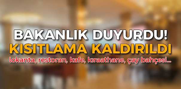 İçişleri Bakanlığı genelgesine göre lokanta, restoran, kafe, kıraathane, çay bahçesi gibi işletmelerin çalışma saatine yönelik kısıtlamalar kaldırıldı. Komuya ilişkin olarak, İçişleri Bakanlığı 81 İl Valiliğine, “Lokanta, restoran, kafe, kıraathane vb. işyerlerinin çalışma saatleri” hakkında genelge gönderdi. Genelgeye göre, 21 Temmuz’dan itibaren lokanta, restoran, kafe, kafeterya, çorbacı, kokoreççi, çiğ köfteci, kıraathane, kahvehane, çay bahçesi, dernek lokali vb. işletmelerin çalışma saatlerine yönelik kısıtlamalar kaldırıldı.