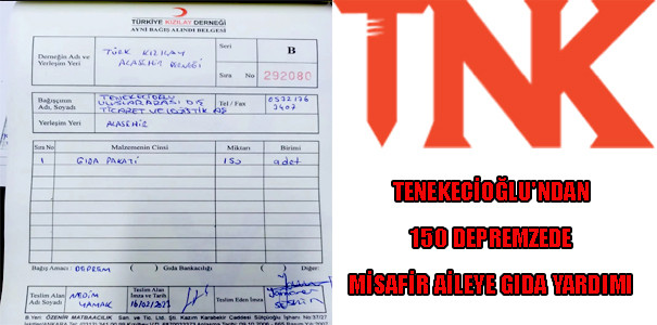 Alaşehir'e ve Alaşehirlilere yatırım ve destekleriyle bilinen Tenekecioğlu A. Ş. de Alaşehir'e gelen 150 depremzede ailemizi unutmadı ve desteklerini sürdü. İlçemize gelen 150 depremzede aile için gıda paketi hazırlatan Tenekecioğlu Dış Ticaret Ve Lojistik A.Ş paketleri ailelere ulaştırması için Kızılay ve AFAD ekibine teslim etti.