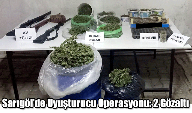 Manisa İl Jandarma Komutanlığı İstihbarat ve KOM Şube Müdürlükleri ile Sarıgöl ilçe Jandarma Komutanlığı ekipleri tarafından uyuşturucu operasyonu düzenlendi. .Ç. (57) ve S.Z. (47) isimli şahısların evlerine düzenlenen baskında 16 kilo 250 kilogram kubar esrar, 295 adet fide halinde kenevir bitkisi, 325 gram kenevir tohumu, 3 adet ruhsatsız av tüfeği ele geçirildi.
