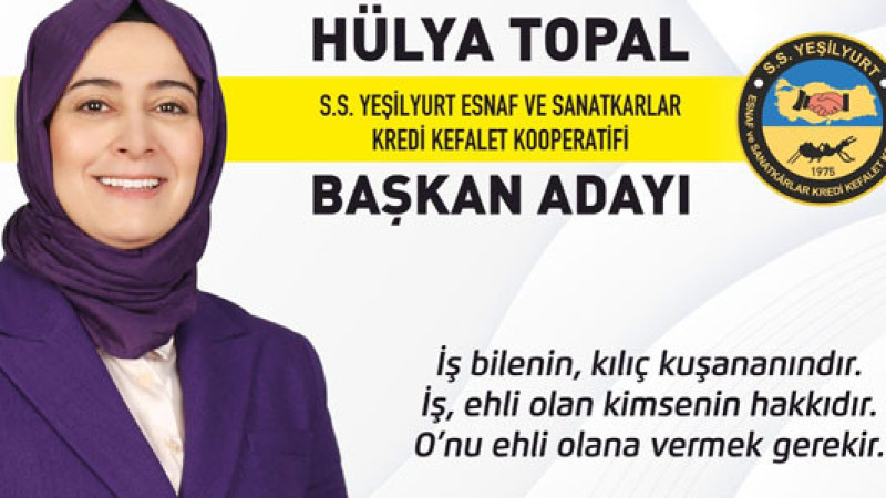 Yaklaşık 25 yıldır esnaf ve sanatkarlarla iç içe olduğunu, esnaf ve sanatkarlara hizmet noktasında çeşitli kademelerde bilfiil hizmet verdiğini hatırlatan Hülya Topal, "şimdi ustalık dönemim" diyerek adayığını duyurdu. Deneyimli kadın aday Topal, adaylığı ile ilgili olarak şunları söyledi; " 25 yıldır bilfiil esnaf ve sanatkârlarımıza hizmet vermekteyim. Bu işe çıraklıktan başladım, şimdi ustalık dönemim diyerek Yeşilyurt Esnaf ve Sanatkarlar Kredi Kefalet Kooperatifine başkan adayı olduğumu açıklıyorum. Nasip olur da başkan seçilirsem, bu güne kadar olduğu gibi özveri, güleryüz ve dürüstlüğüm ile aynı şekilde siz değerli esnaf ve sanatkarlarımıza bilgi ve tecrübemle hizmet vereceğime söz veriyorum. Bu kutsal göreve arkadaşlarım ile birlikte çıktık. Bizlere güvenen ve değer veren tüm ortaklarımızın desteklerini bekliyoruz"